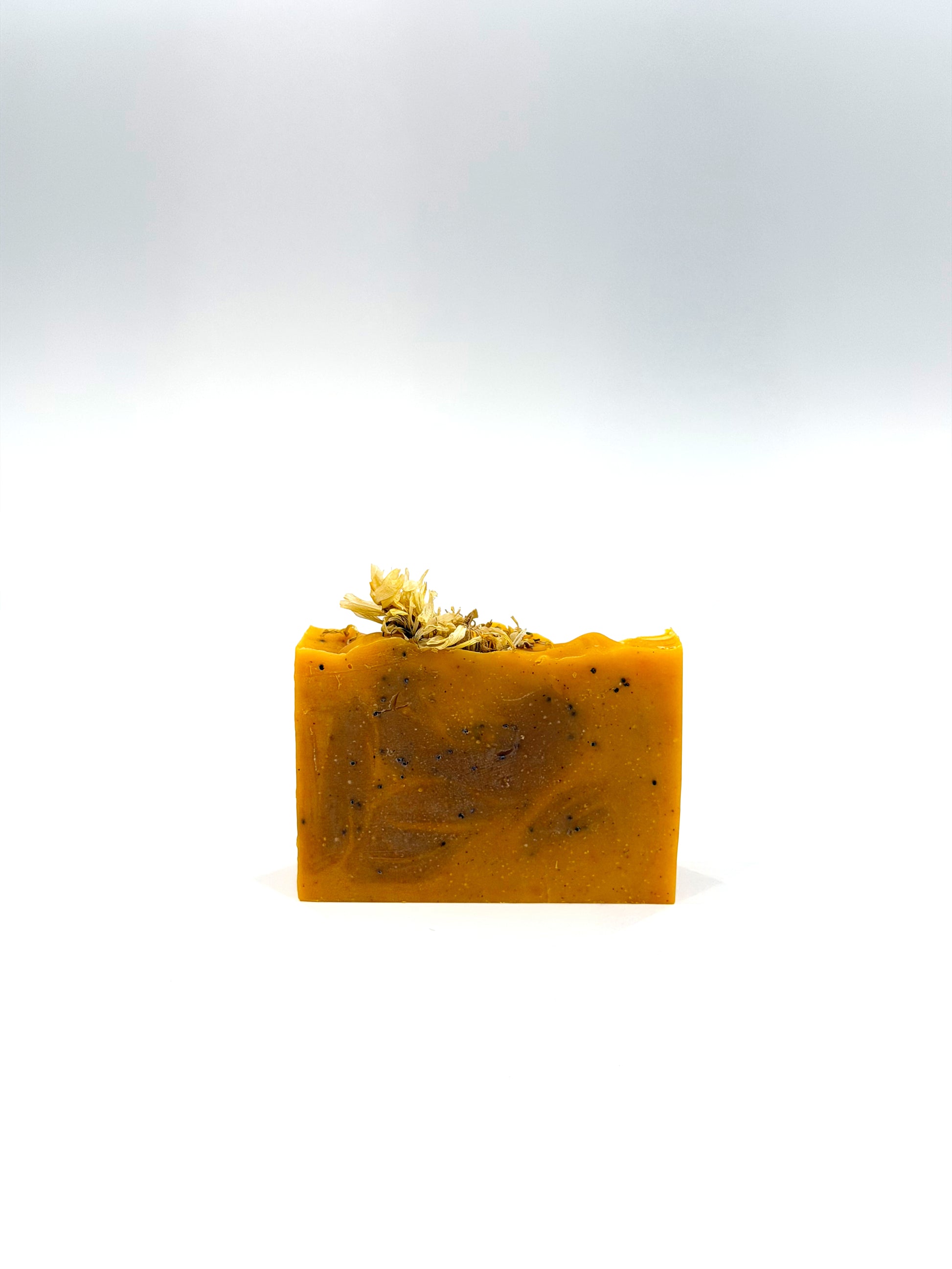 Colored naturally with annatto powder, the bar displays warm orange tones. Poppy seeds are included inside the bar to provide gentle exfoliation. A delicate decorative touch of calendula flowers graces the surface and can be removed before use if preferred.
