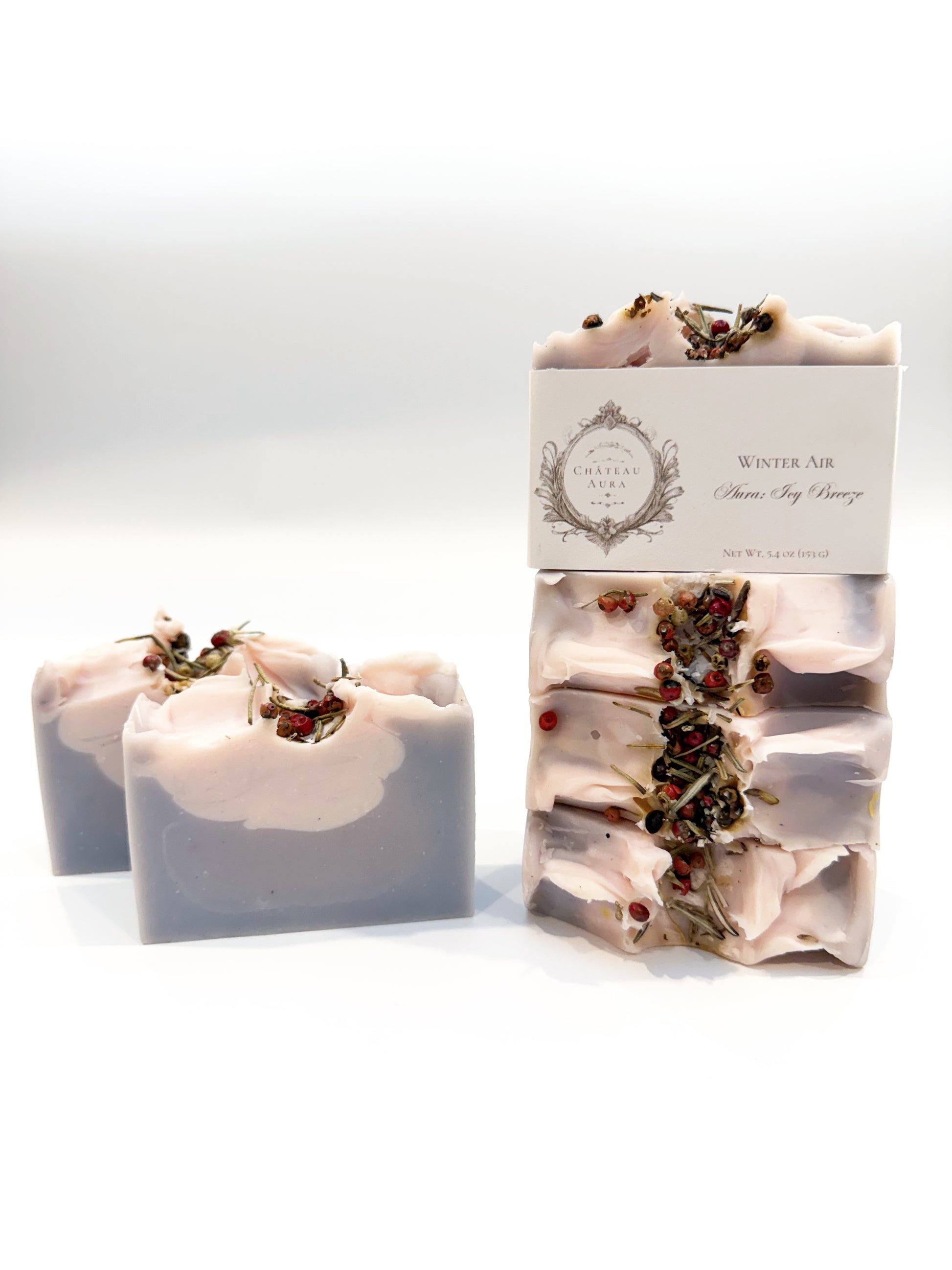 At Chateau Aura, every creation is a handcrafted ritual designed to elevate your aura — a moment of calm, beauty, and intention woven into the everyday. Winter Air embodies this philosophy with a crisp, fresh fragrance reminiscent of the winter air and coastal breeze. The aroma is lightly invigorating, clean, and refreshing, evoking soft aquatic florals, sea salt, ocean mist, and subtle notes of rosemary and pink peppercorn.